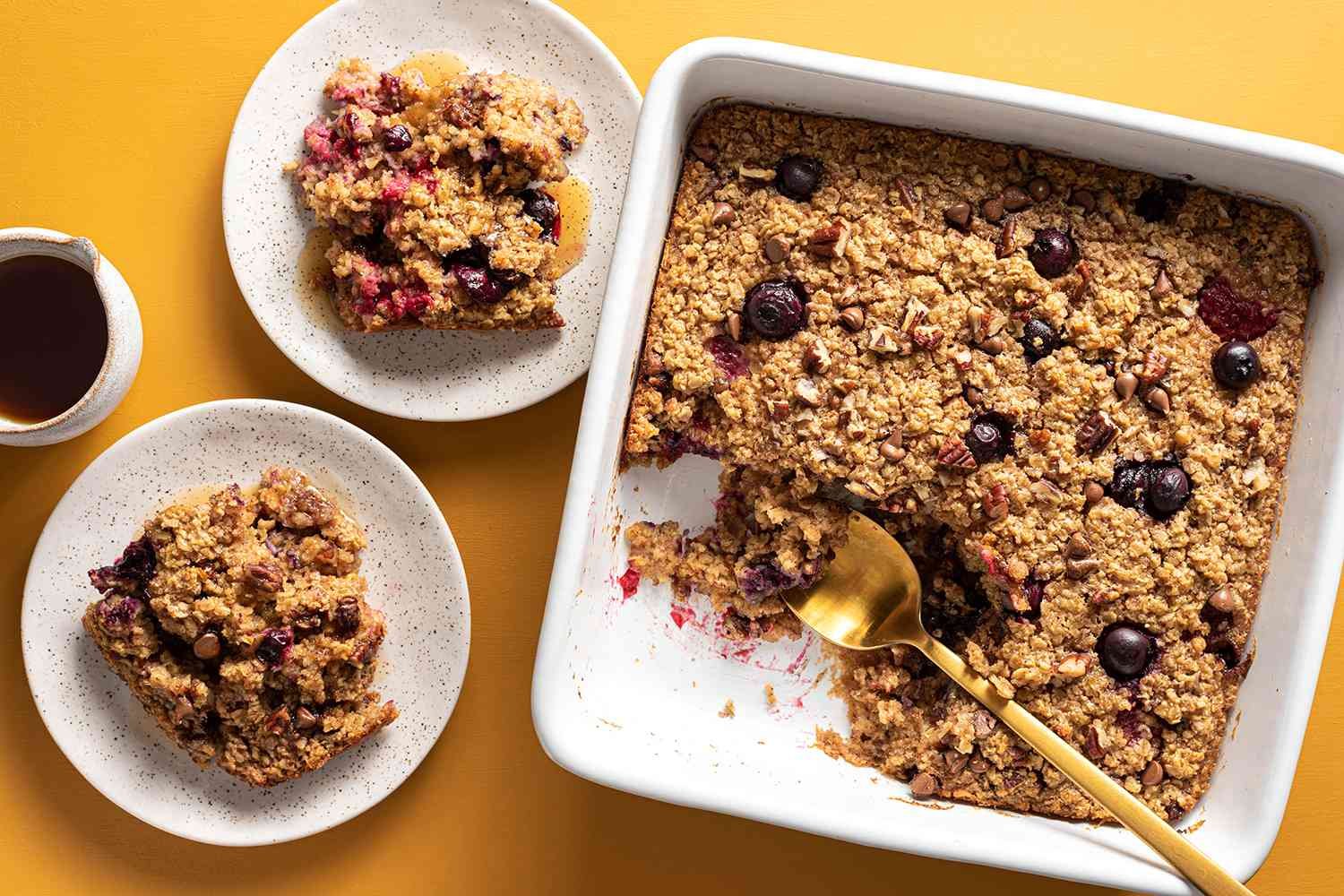 Let the baked oatmeal cool for about 5 minutes. To serve, slice or scoop it onto plates and drizzle with syrup or top with yogurt, as desired.