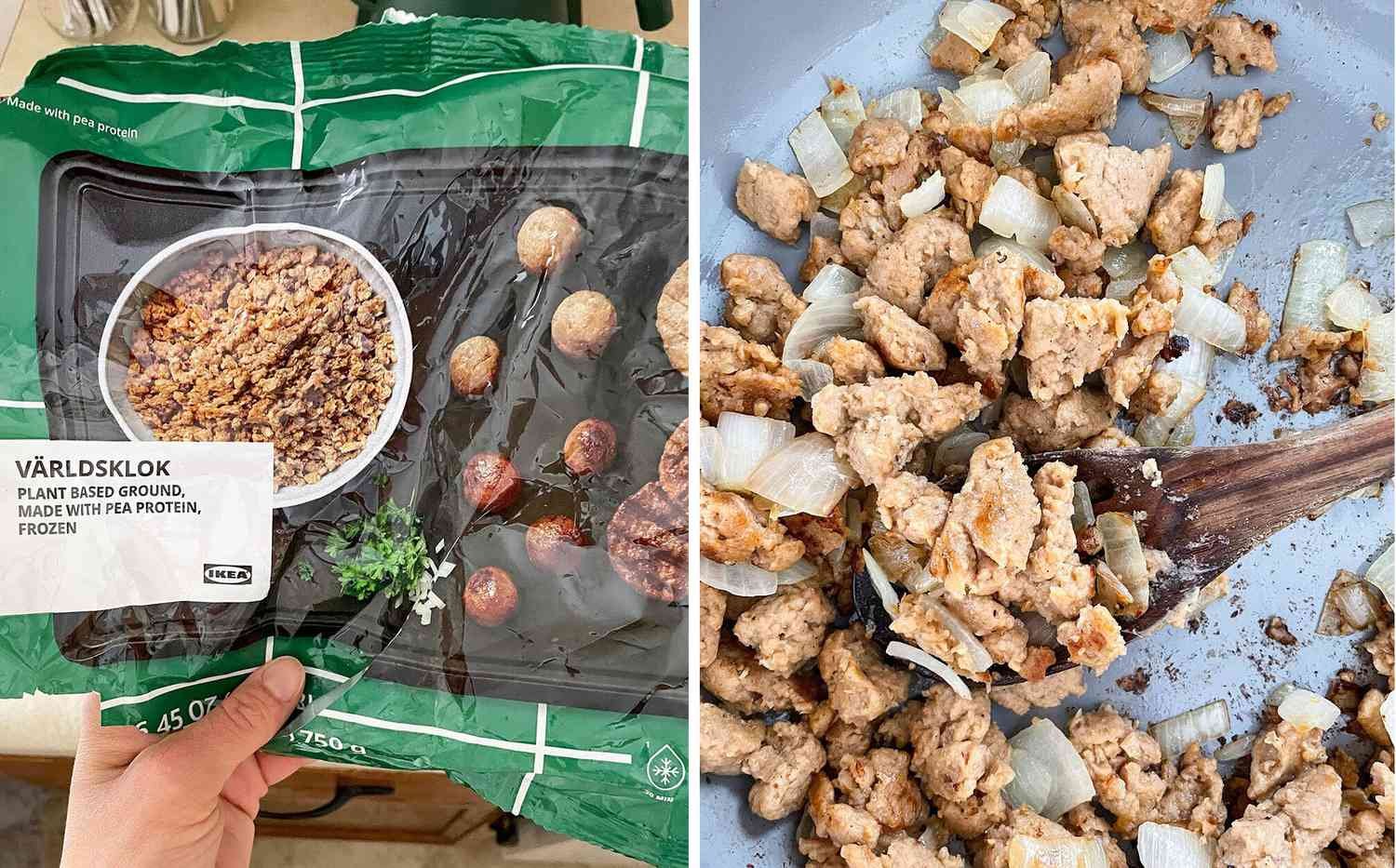 I’d previously tried IKEA’s ready-made plant-based meatballs—called Huvudroll—and loved them. The pre-made meatballs are super savory, with a sweet undertone, thanks to oats and apples in the mix. In contrast, the Världsklok has a more neutral flavor palate, which makes it perfect for adding to your own recipes. There’s an impressive amount of protein in each serving—11 grams of pea-based protein for 4 ounces—and a modest amount of sodium. (I’ve tried frozen foods with a lot more than 450 milligrams per serving.) But how does it taste? And is it easy to cook with? I did some experiments with the 1.6-pound bag to find out.