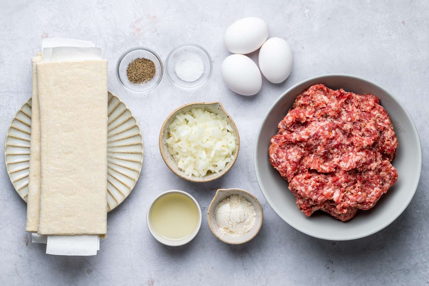 You only need four main ingredients to make the sausage rolls. The other items are all kitchen staples. After a quick sauté, chopped onions are mixed with ground sausage meat along with two eggs, salt, and pepper.