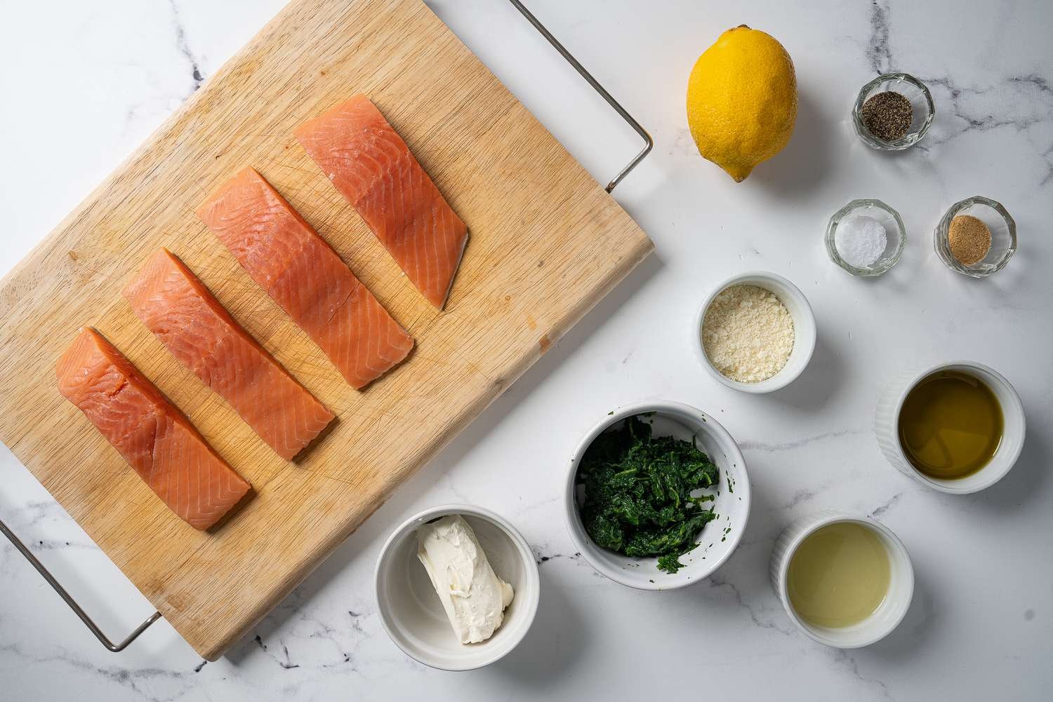 Using creamed spinach as inspiration we blended cream cheese with thawed, frozen spinach, garlic powder, and parmesan cheese. Adding one or two tablespoons to a “pocket” created in each fillet adds a savory punch to every single bite. It’s big on flavor, without a ton of extra work.