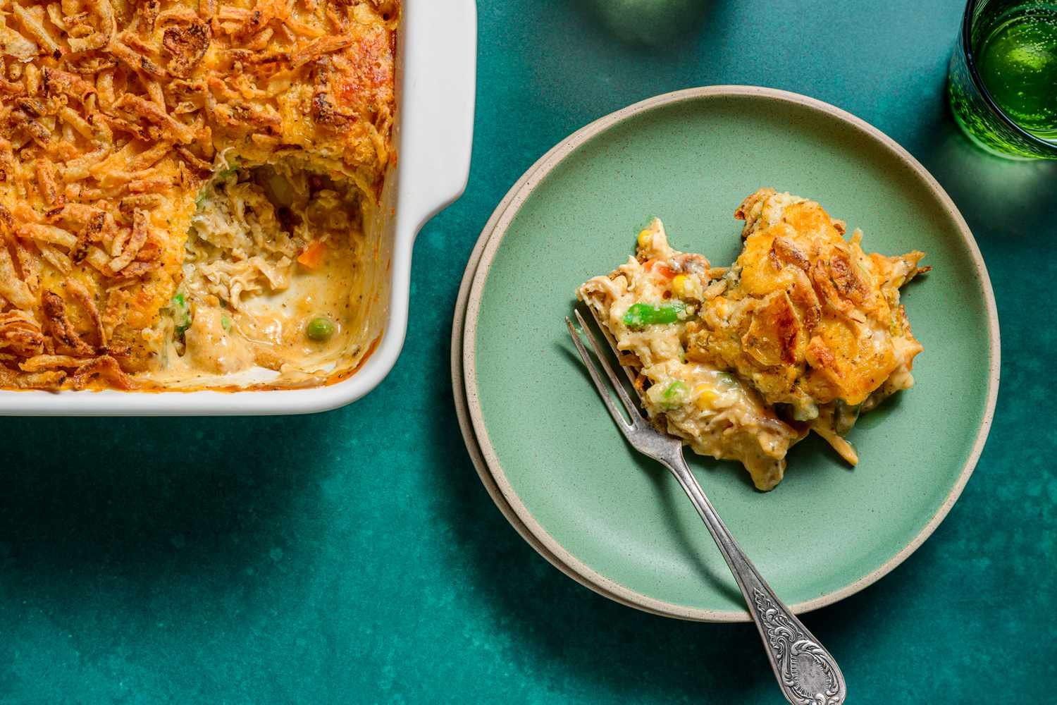 Place the casserole dish on a baking sheet and bake for 50 minutes, then top with fried onion pieces.